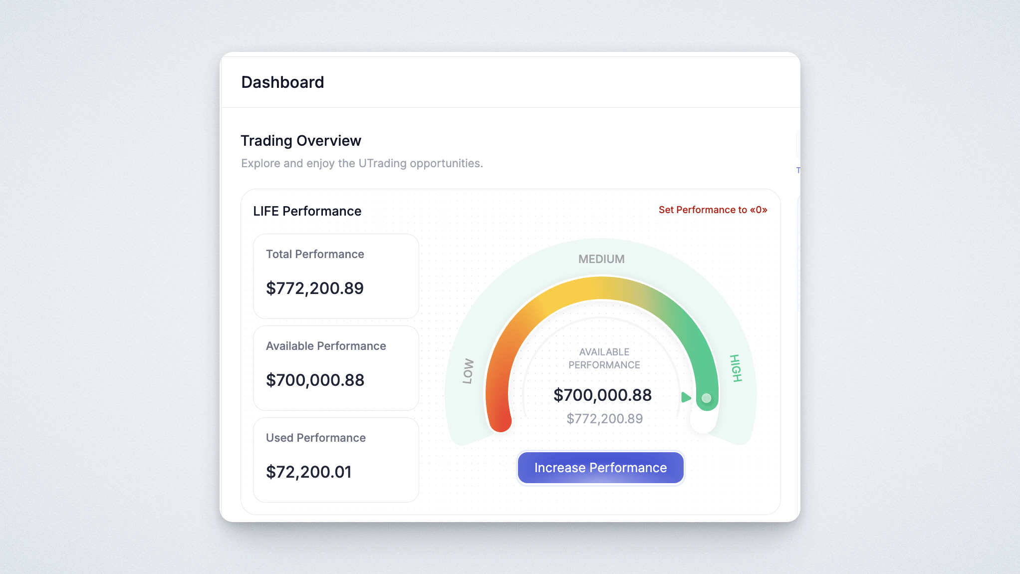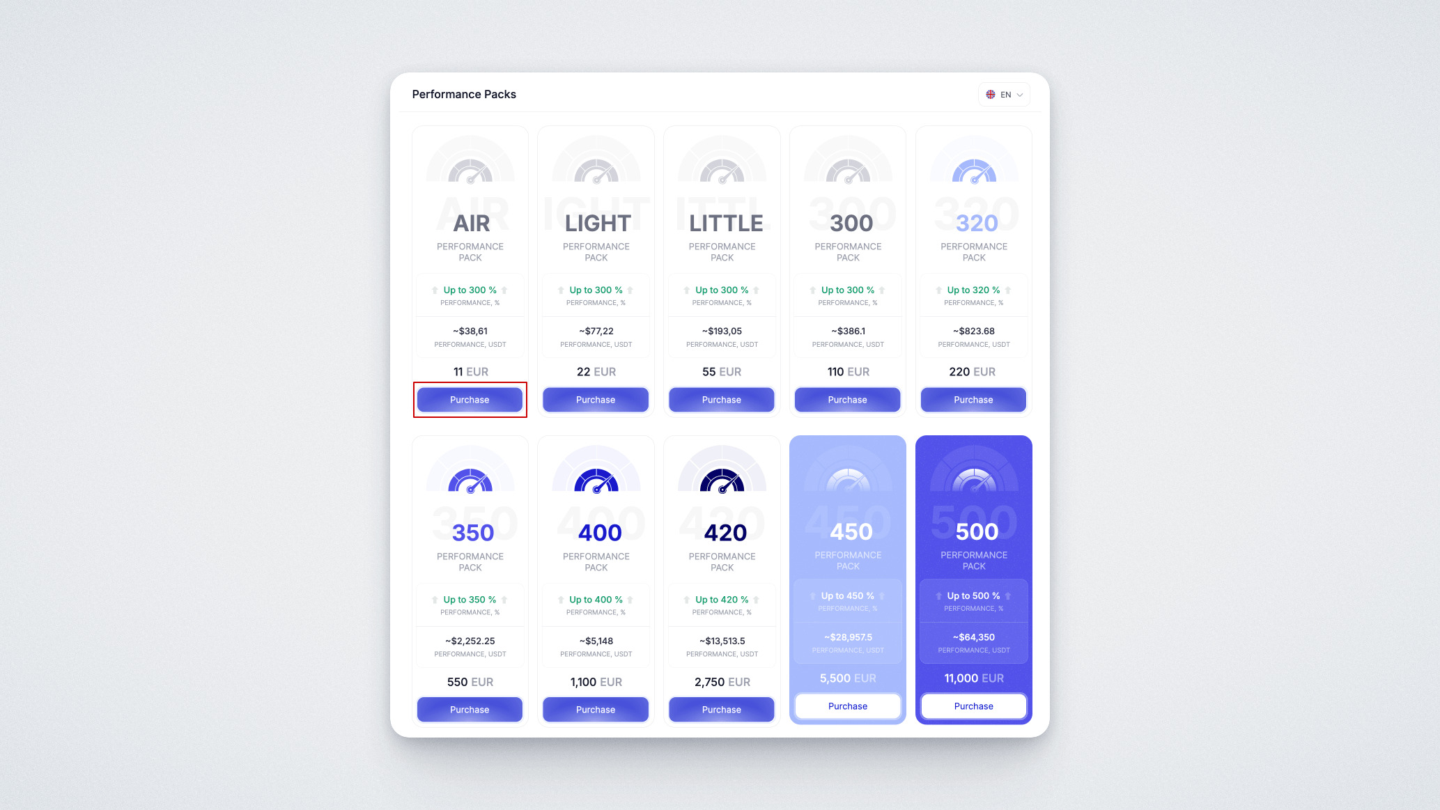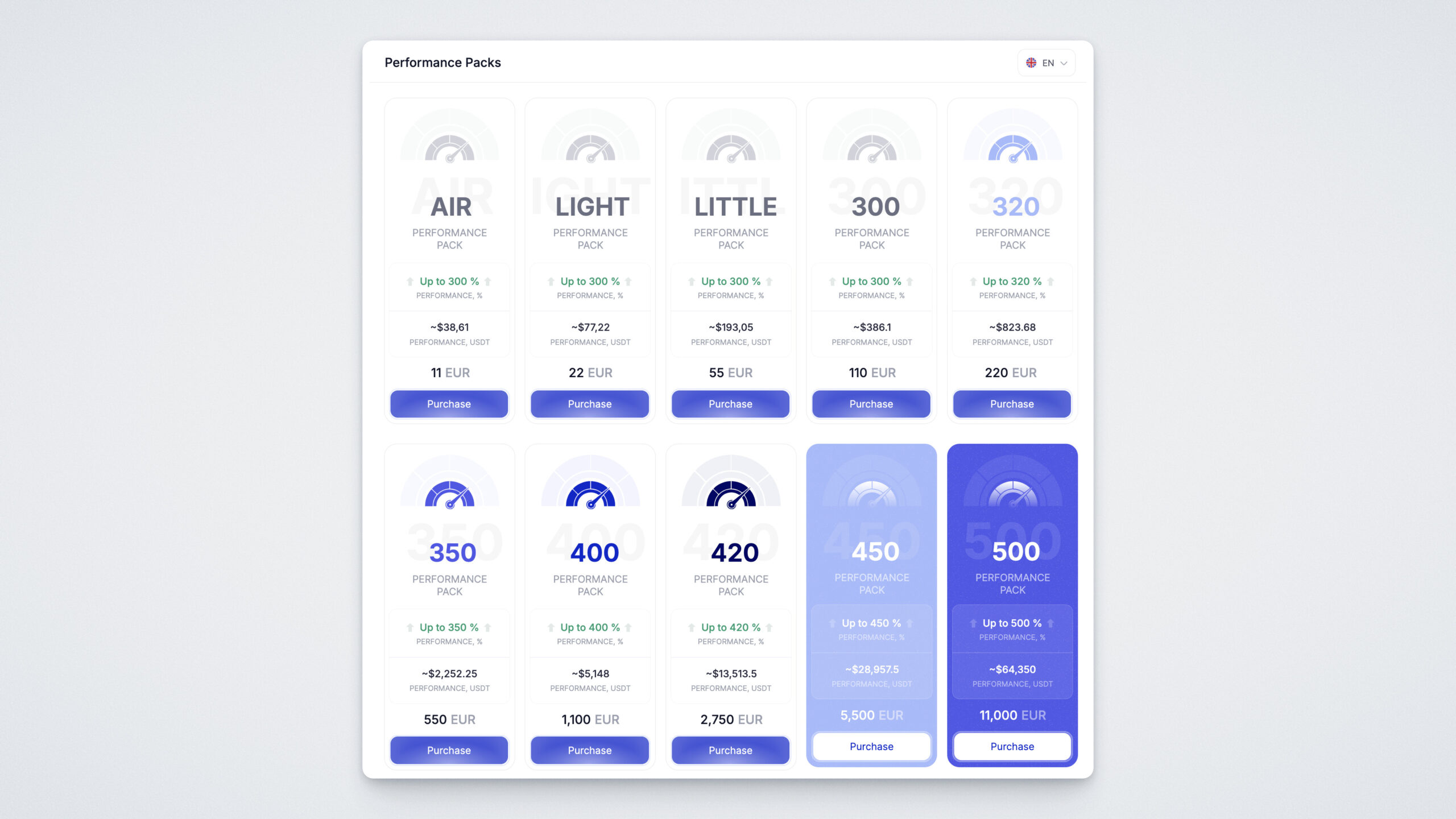 Mit einem Performance Pack erhalten Sie Zugang zu Ihrem persönlichen Trading-Bot, der rund um die Uhr arbeitet und Profite in Form von USDT generiert. Sie wählen ein Paket aus – im Wert von 11 bis 110.000 Euro (in UPT) – und erhalten Zugriff auf den Bot. Es gibt verschiedene Leistungsstufen — bis zu 600 % und eine flexible Auswahl für jedes Budget. Der Bot läuft kontinuierlich, bis sein Leistungslimit ausgeschöpft ist. Sobald das Limit erreicht ist, müssen Sie ein neues Performance Pack erwerben.