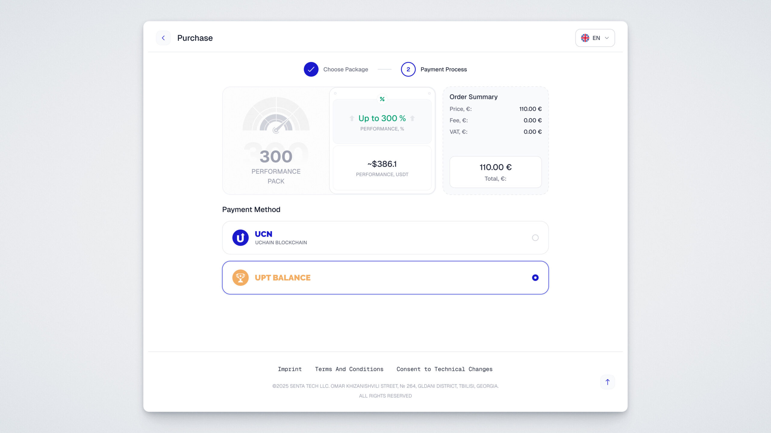 Wählen Sie im sich öffnenden Fenster die Zahlungsmethode – mit dem UPT-Token – aus, bestätigen Sie Ihr Einverständnis mit den Zahlungsbedingungen, indem Sie die erforderlichen Kontrollkästchen aktivieren, und klicken Sie auf die Schaltfläche „Purchase“.